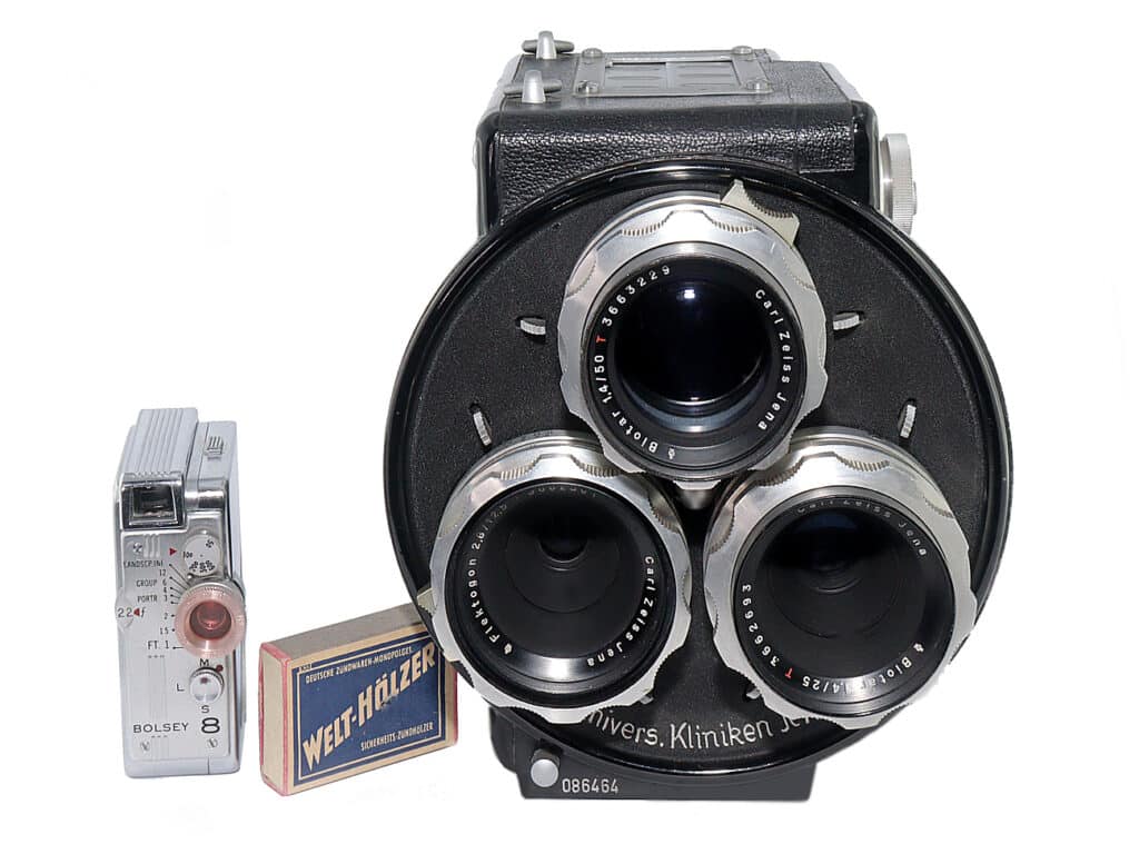 Seit Januar 2025, also ein ganzes Jahr, arbeiteten die Macher des Deutschen Kameramuseums in Plech an der Sichtung, listenmäßigen Erfassung und Veröffentlichung wenigstens von ein paar Dutzend der erlesenen Schmalfilmkameras aus der Zustiftung Liliane Gschrey, die dem Museum den Nachlass ihres Großvaters überließ. Hier als „Appetithäppchen“ die kleinste und die größte Filmkamera aus der Spende Gschrey: die Bolsey 8 aus den USA („Kleinste Filmkamera der Welt“) und die 16-mm-Profikamera Pentacon AK 16 aus der früheren DDR.