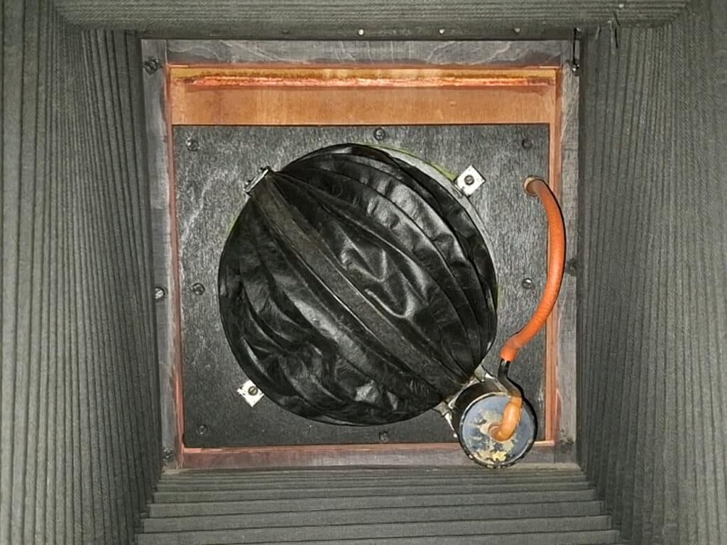 Der Grundner-Verschluss in der OKA-Kamera in Betrieb (von der offenen Rückseite aus gefilmt): Mittels des Blasebalgs am Gummischlauch, der ins Innere der Kamera führt (Bild), kann der Fotograf durch einen beherzten Druck auf den Gummibalg die beiden Hälften der Verschluss-Halbkugel mehr oder minder lang geöffnet halten. Video: Kurt Tauber