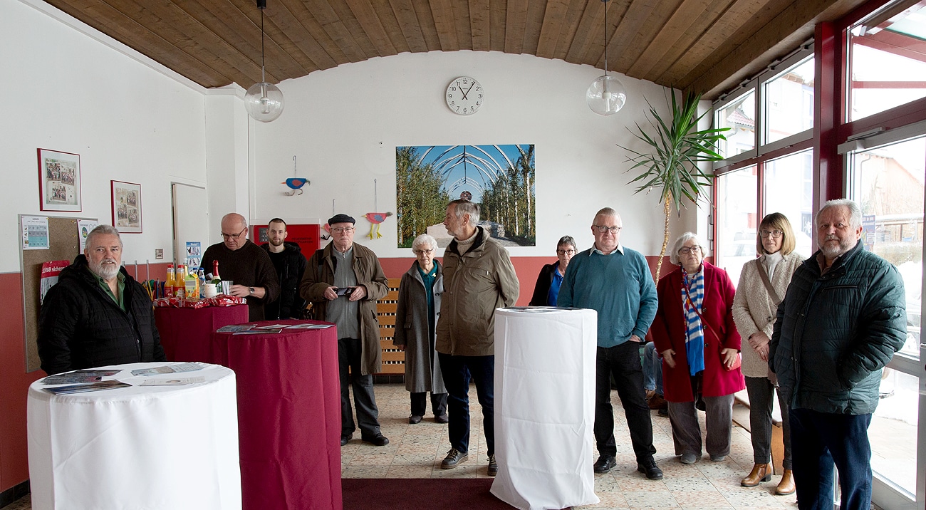Richard Jähner erklärte den Gästen beim Rundgang Motive und Technik. Mit im Bild (3. und 4. von links): zwei der vier Plecher Bürgermeisterkandidaten, Stefan Ditl (ÜWG) und Heidi Gentsch (SPD, leicht verdeckt). Bild: Georg Klerner-Preiß